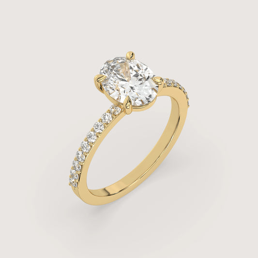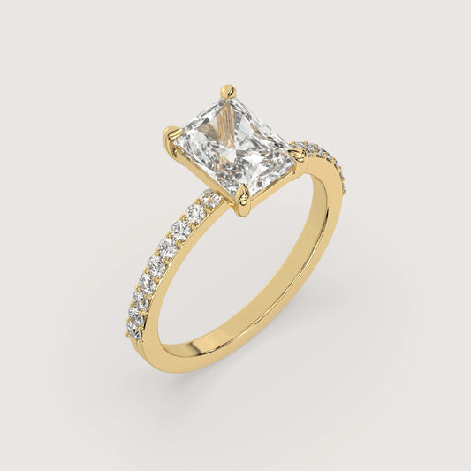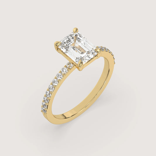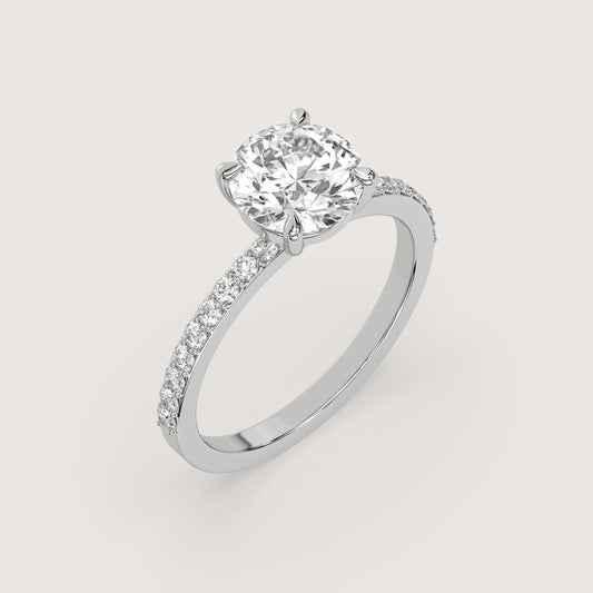 Ein zusätzliches Pavé-Band verleiht dem Verlobungsring noch mehr Glamour. Ein Pavé-Besatz ist ein Ringdesign, bei dem kleine, dicht aneinander gereihte Diamanten auf der Oberfläche des Rings eingefasst werden, sodass der Verlobungsring durchgehend funkelt und den größeren Diamanten zusätzlich betont.