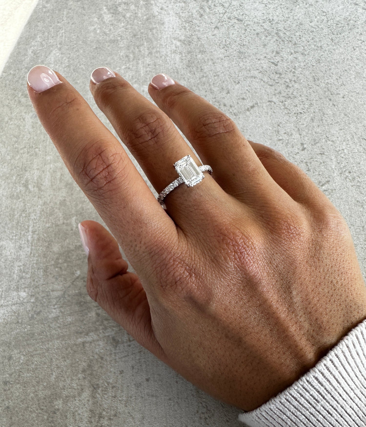 Ein zusätzliches Pavé-Band verleiht dem Verlobungsring noch mehr Glamour. Ein Pavé-Besatz ist ein Ringdesign, bei dem kleine, dicht aneinander gereihte Diamanten auf der Oberfläche des Rings eingefasst werden, sodass der Verlobungsring durchgehend funkelt und den größeren Diamanten zusätzlich betont.